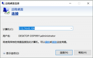 6.输入自己的服务器ip地址,点击连接,如果提示输入用户名,一般用户名为administrator 密码是你自己在控制台设置的密码。弹出其它提示框点确定就是