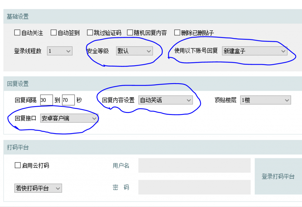 3.点击功能设置 按图中设置 使用刚刚新建的账号盒子进行回复, 回复内容选择自动笑话或采集回复,顶贴楼层选择非1楼则是回复楼中楼